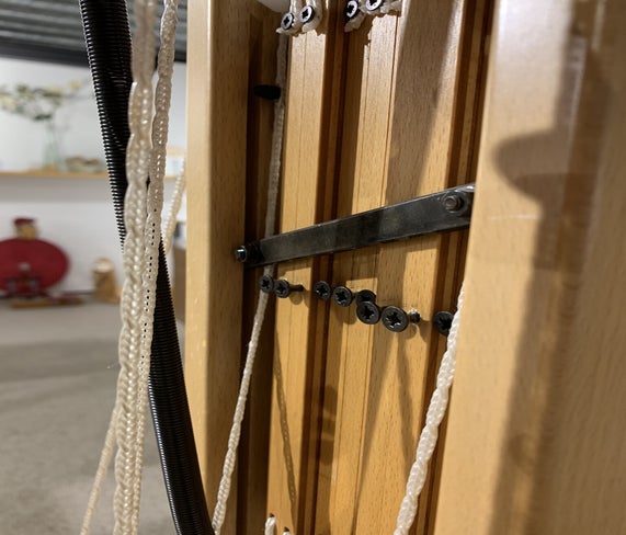 - Tijdens het weven is er steeds een handeling nodig om de kieslatjesketting te transporteren. Bij de Louët Megado en Louët Octado doe je dat door het intrappen van het transportpedaal, bij de Magic dobby draai je met de hand aan een knop.